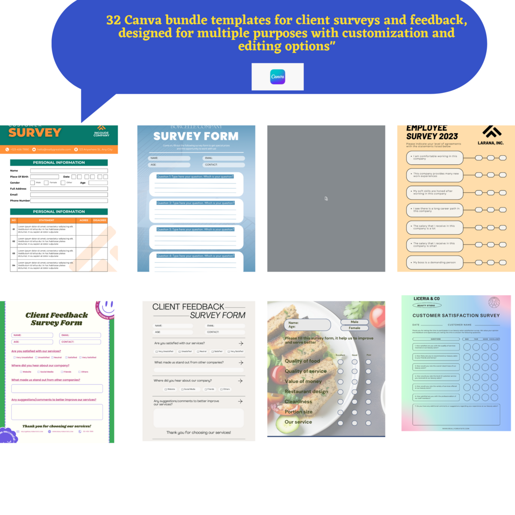 32 Canva bundle templates for client surveys and feedback, designed for multiple purposes with customization and editing options